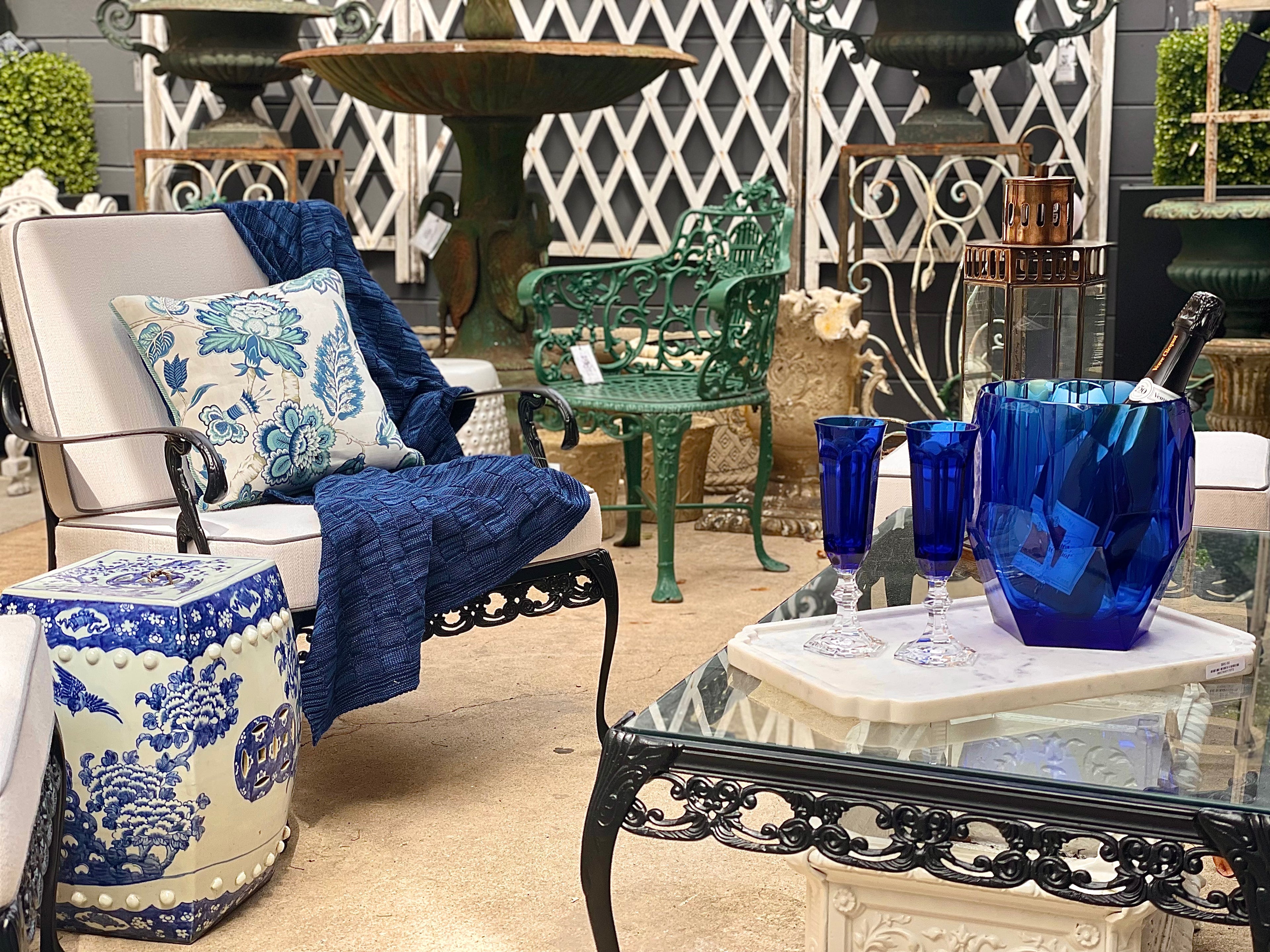 Our walled courtyard showcases our collection of antique, vintage, reproduction, and new furniture, garden ornaments and accessories, pots, urns, fountains and more.