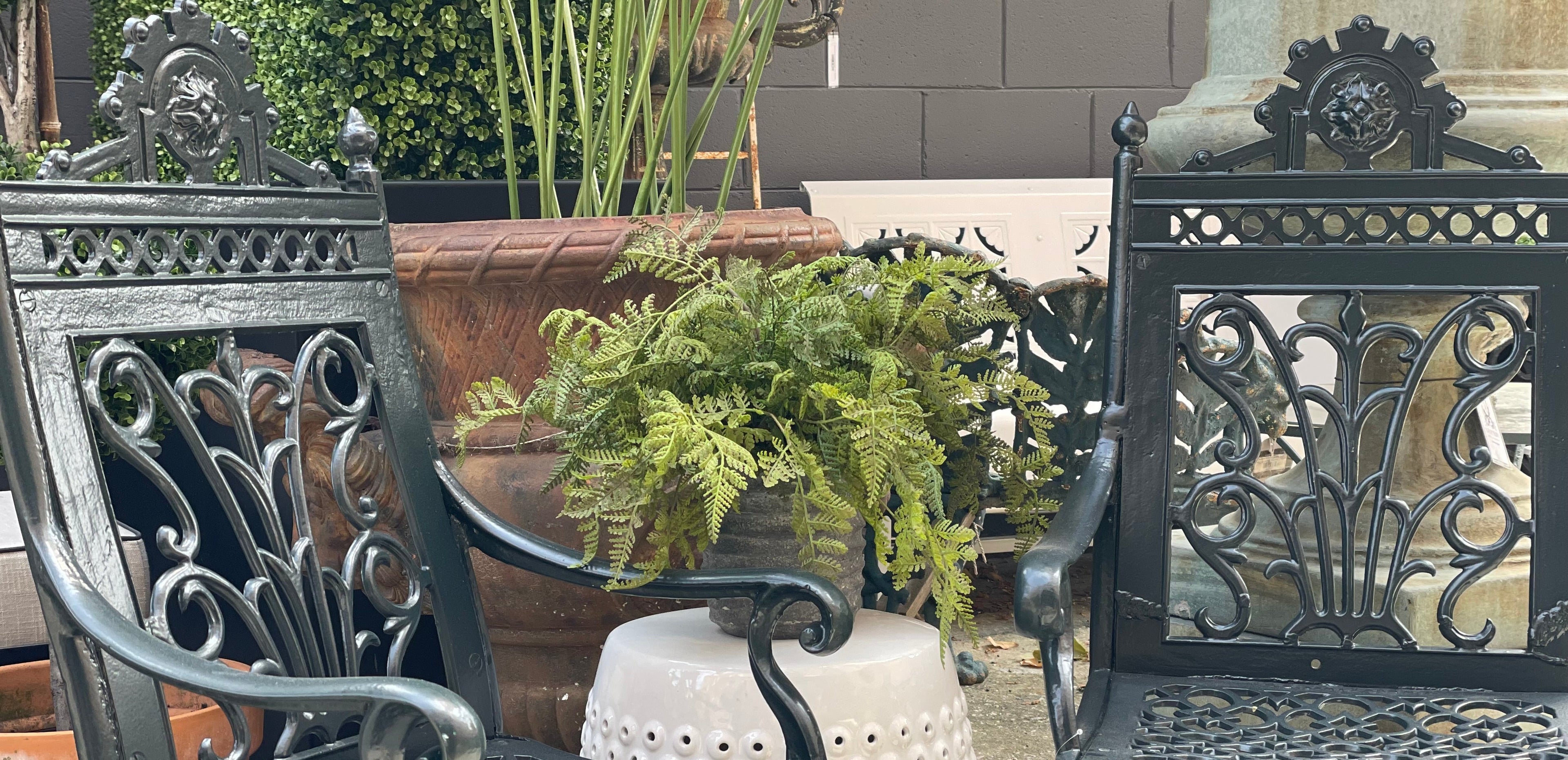 Our walled courtyard showcases our collection of antique, vintage, reproduction, and new furniture, garden ornaments and accessories, pots, urns, fountains and more.
