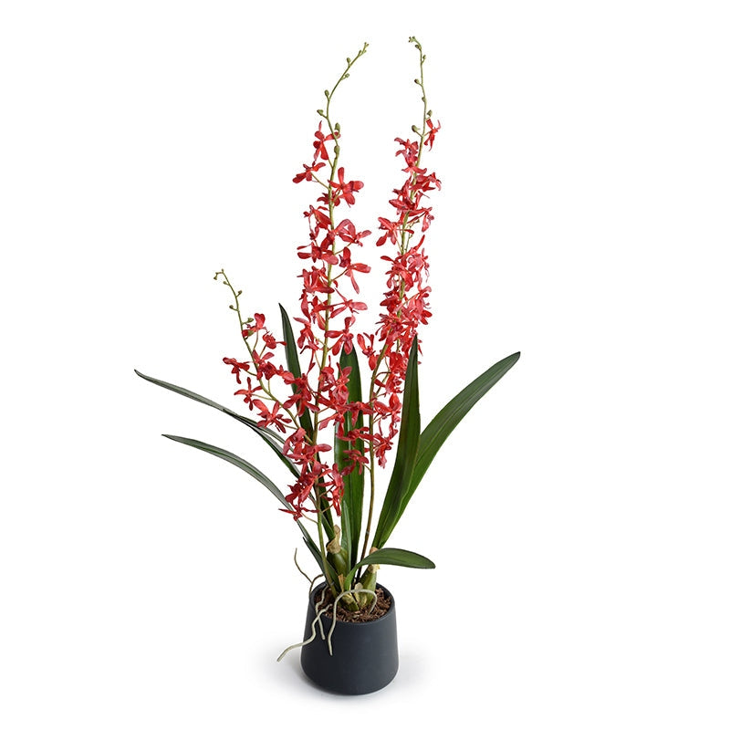 A deep red Arachnid, or Spider Orchid plant with realistic flowers and foliage is mounted in a 5" matte black ceramic planter. This reproduction orchid plant has two flower stems filled with red flowers and small green buds at the tips, and tall, slender, green leaves. Arranged by hand in our facility in North Carolina and permanently set with Durt®, our faux potting mix, in a 7" terra cotta orchid pot.