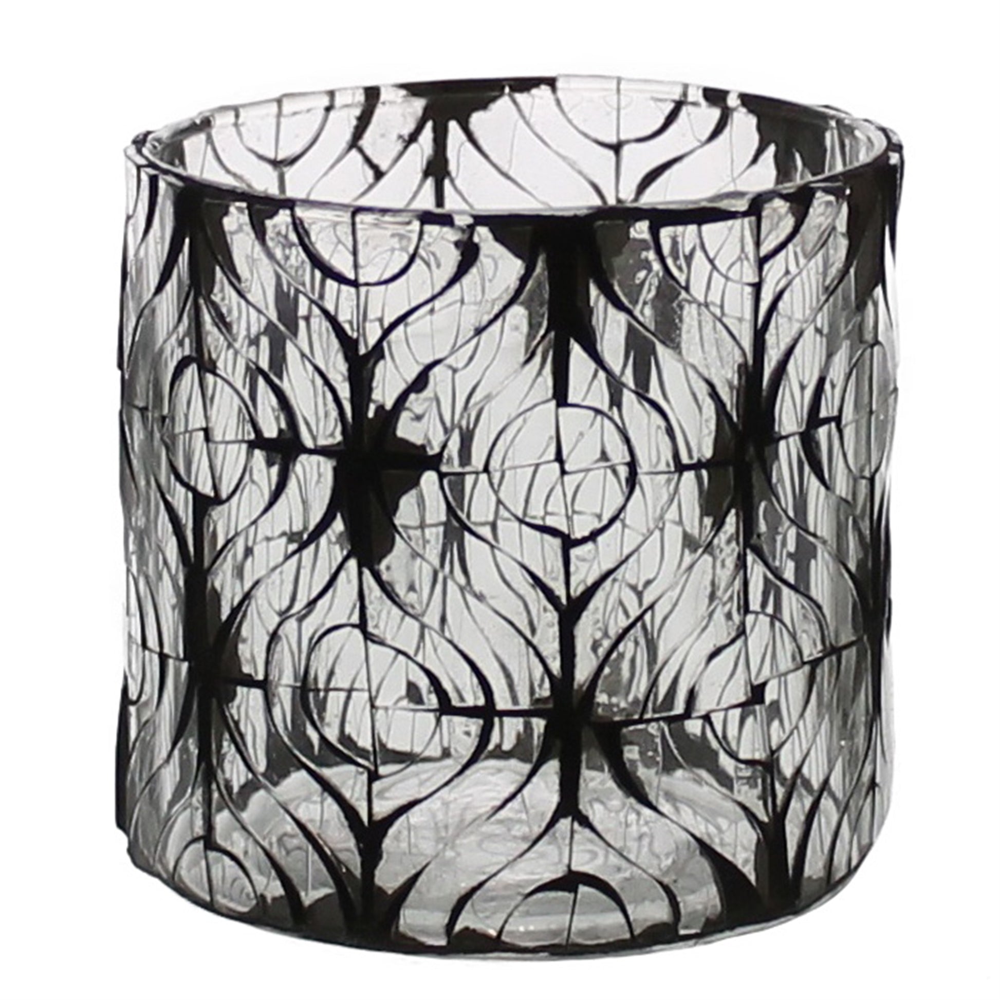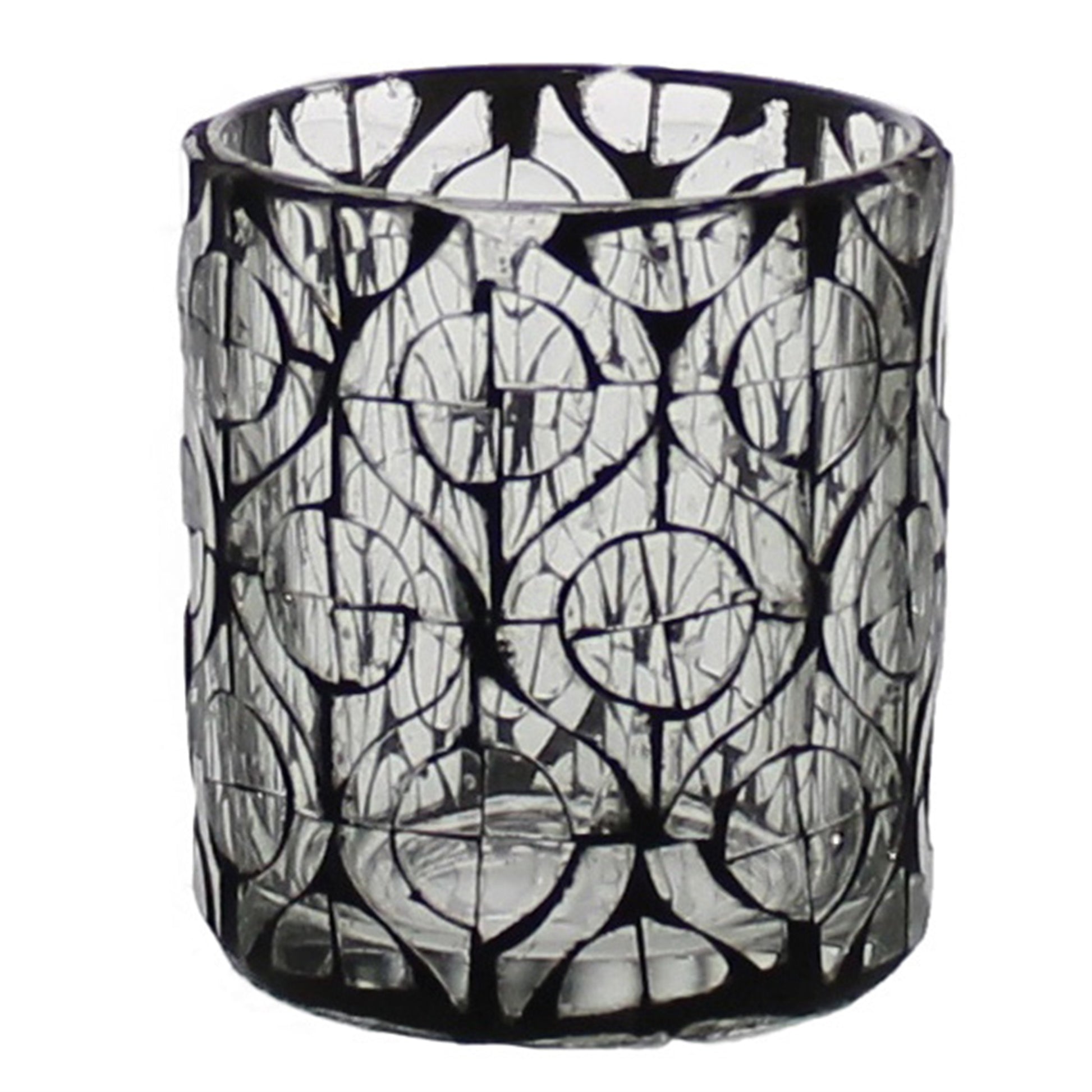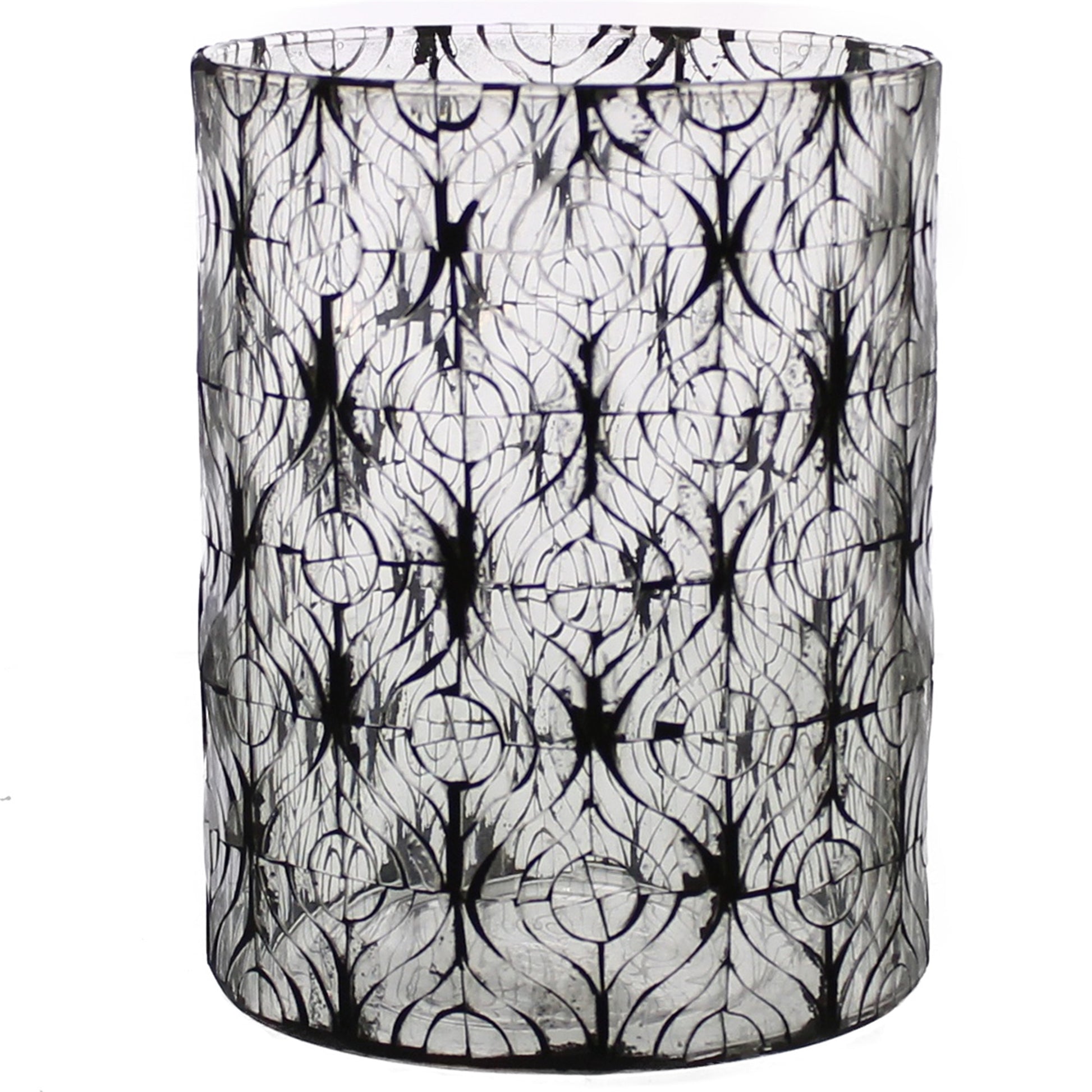 Crystal clear glass is hand cut and laid into intricate patterns then offset by a dark black grout in our updated take on mosaic. Lustrous with a candle or stellar with floral.