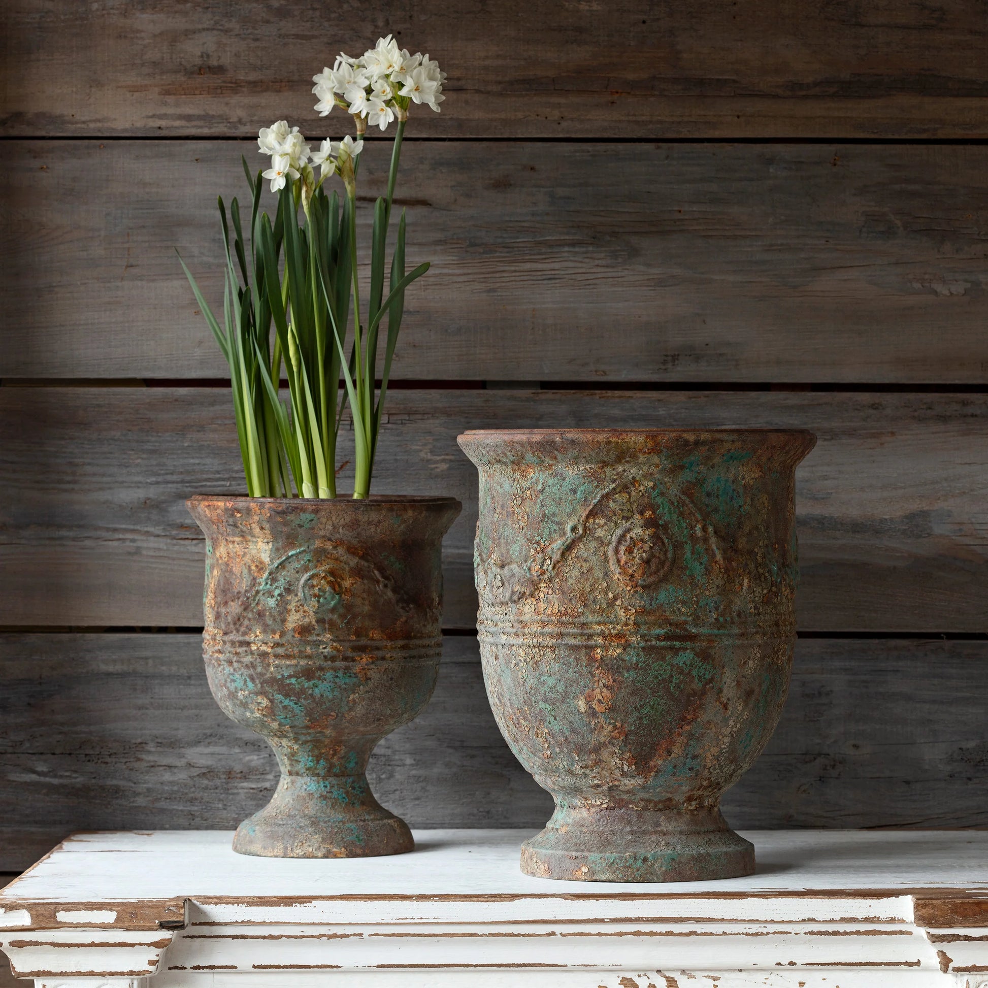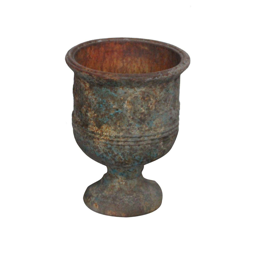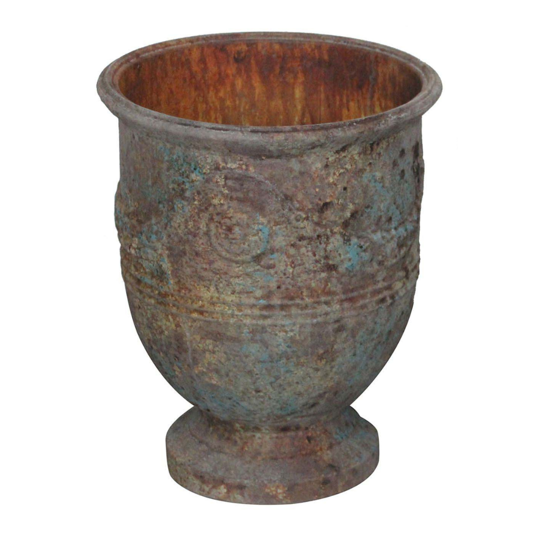 Perfectly Aged Metal French style pots have a sophisticated garden look. These pots are lightweight and are easily moved.