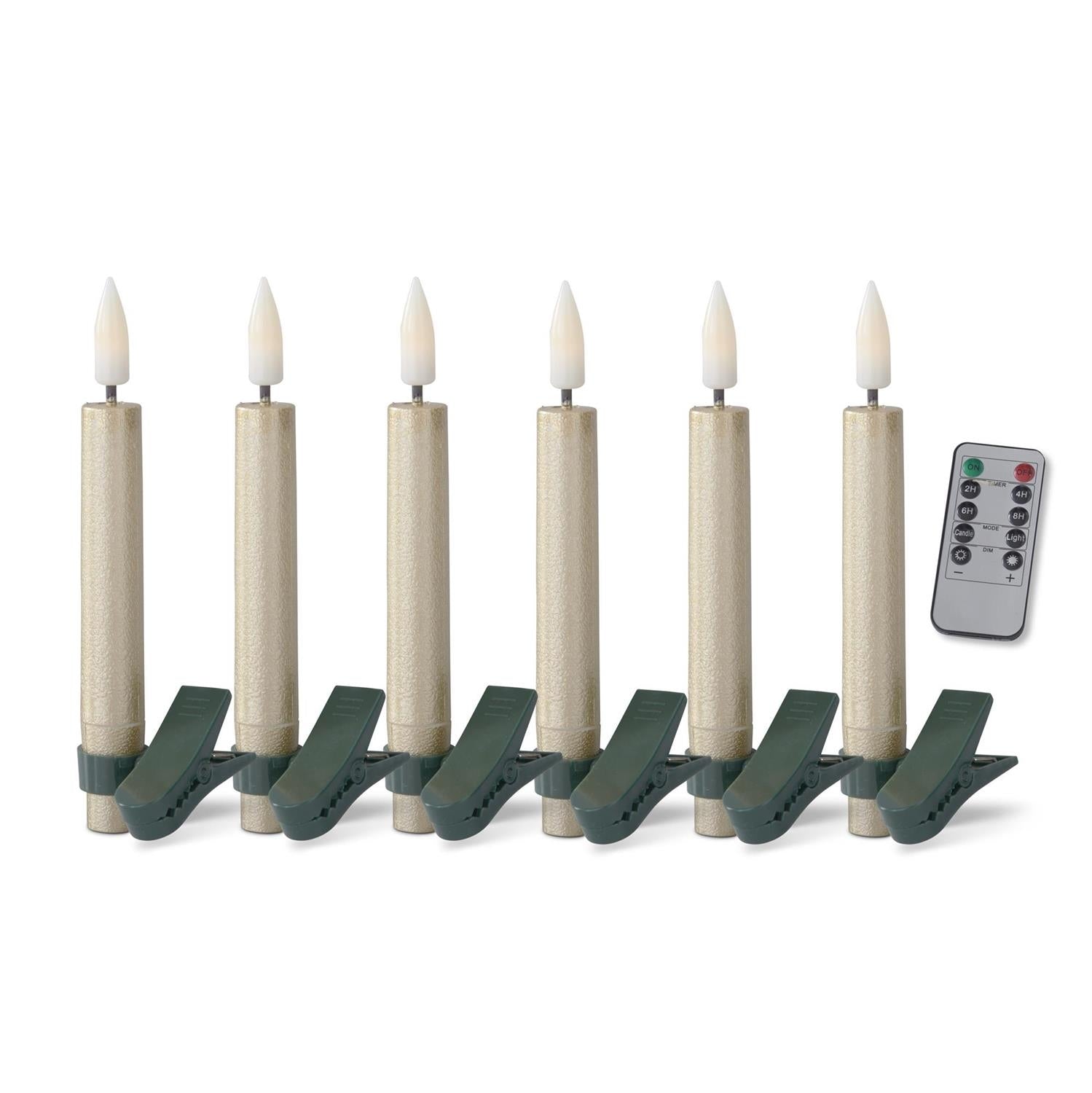 This set of six clip-on LED Christmas tree taper candles uses AAA batteries to give your tree light and sparkle. Best of all, it comes with a remote control to turn them on and off again!
