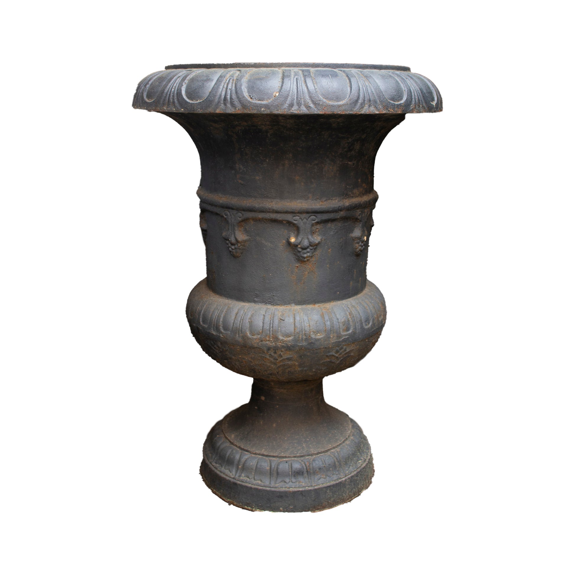 Pair of Iron Urns on Round Bases, height 35 inches, inside diameter 18 1/2 inches.